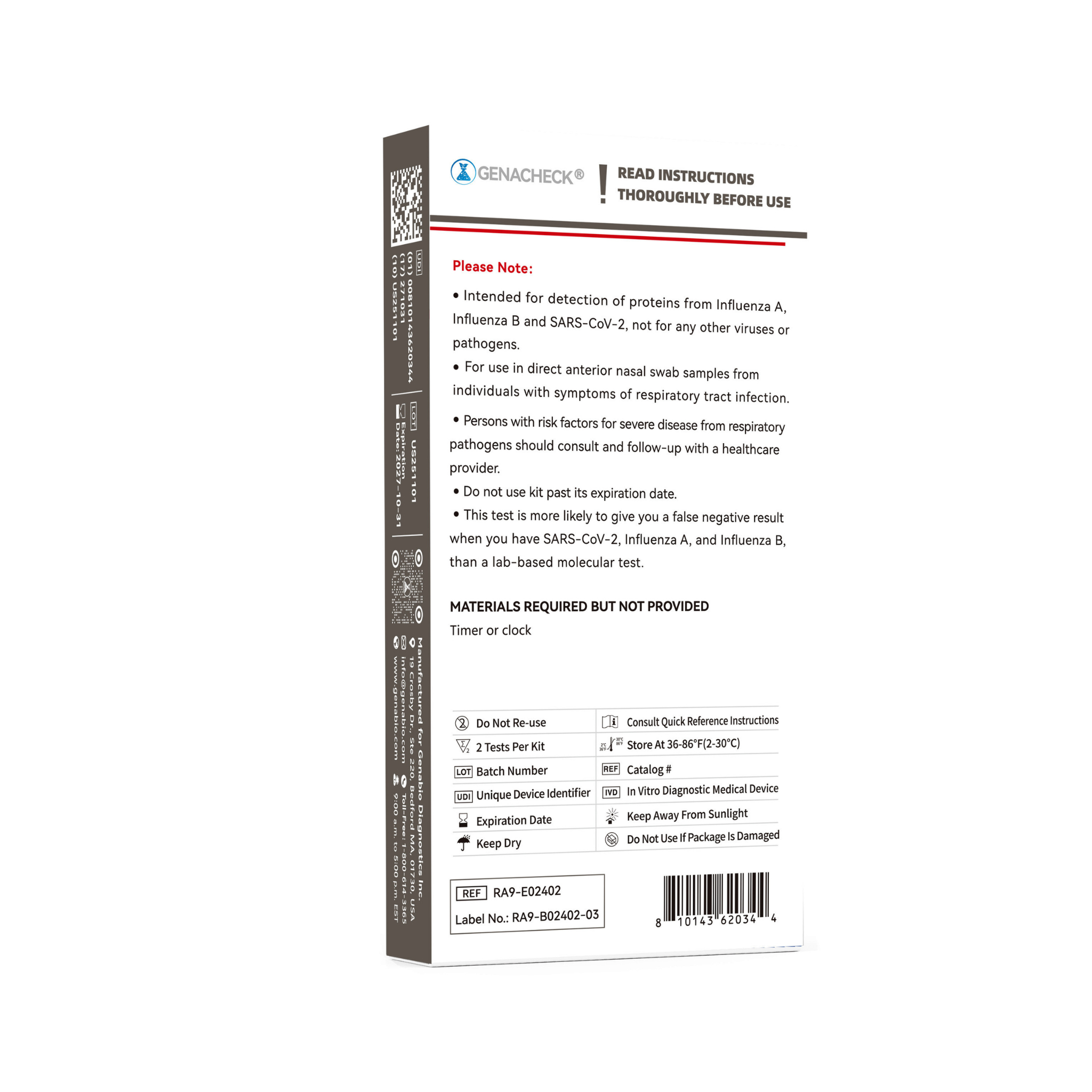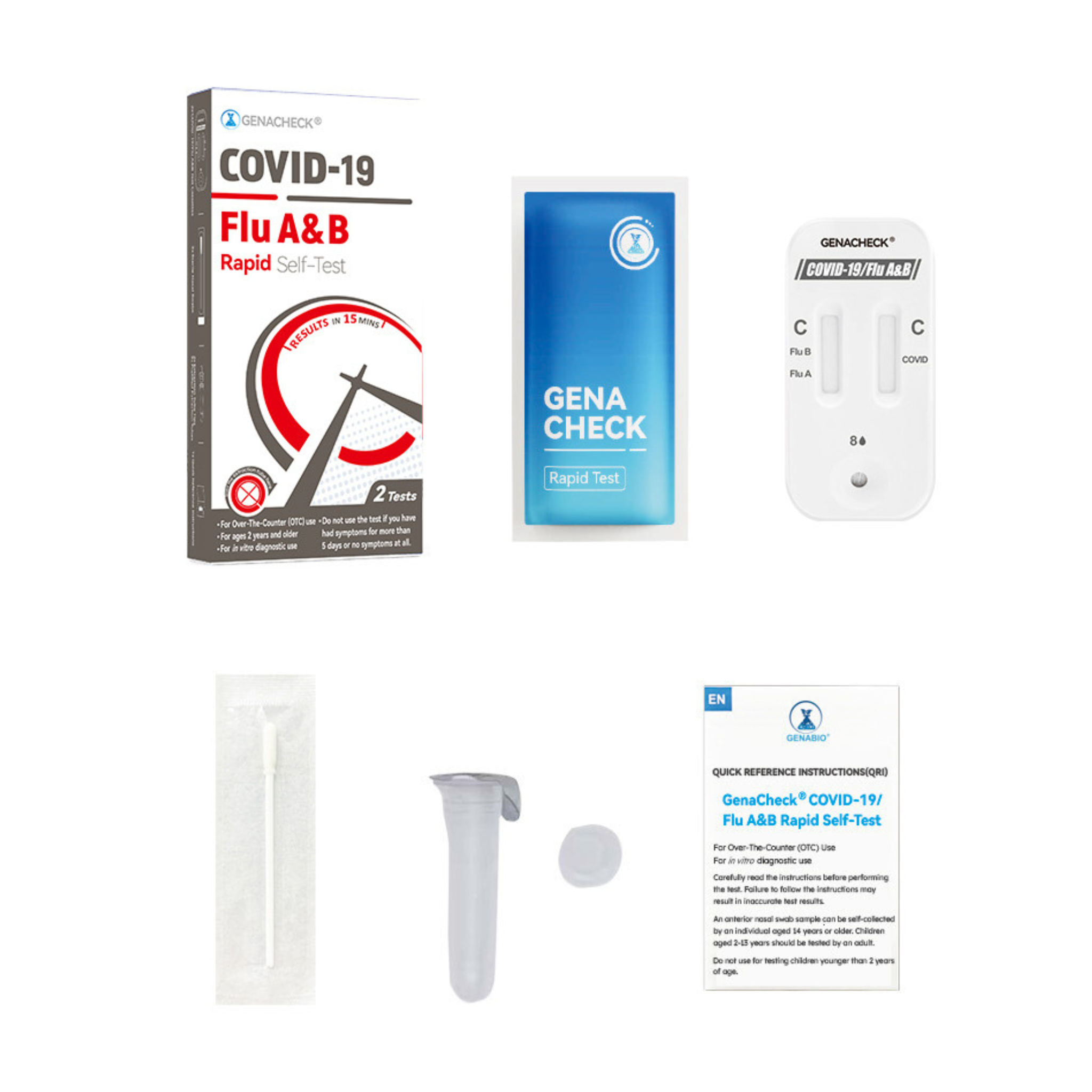 The Genabio GenaCheck® COVID-19 / Flu A&B Rapid Self-Test is an over-the-counter (OTC) rapid antigen test designed for the qualitative detection of SARS-CoV-2, Influenza A, and Influenza B from a single anterior nasal swab.